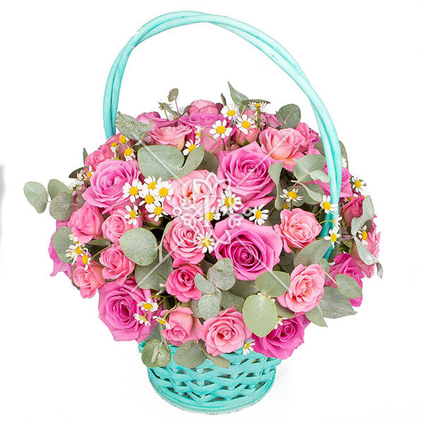 роза розовая – 11 шт., роза розовая кустовая – 6 шт., зелень декоративная (эвкалипт, ромашка, возможна замена на хамелациум), оазис, корзинка.